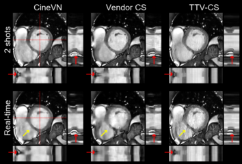 We demonstrate fast inline reconstructions of high-resolution real-time cine MRI with better image quality and more accurate evaluation of cardiac function and myocardial strain compared to state-of-the-art compressed sensing reconstructions. This research was a joint effort of the Computational Imaging Lab with Siemens Healthineers AG, MVZ Diagnostikum Berlin GmbH, and The Ohio State University.